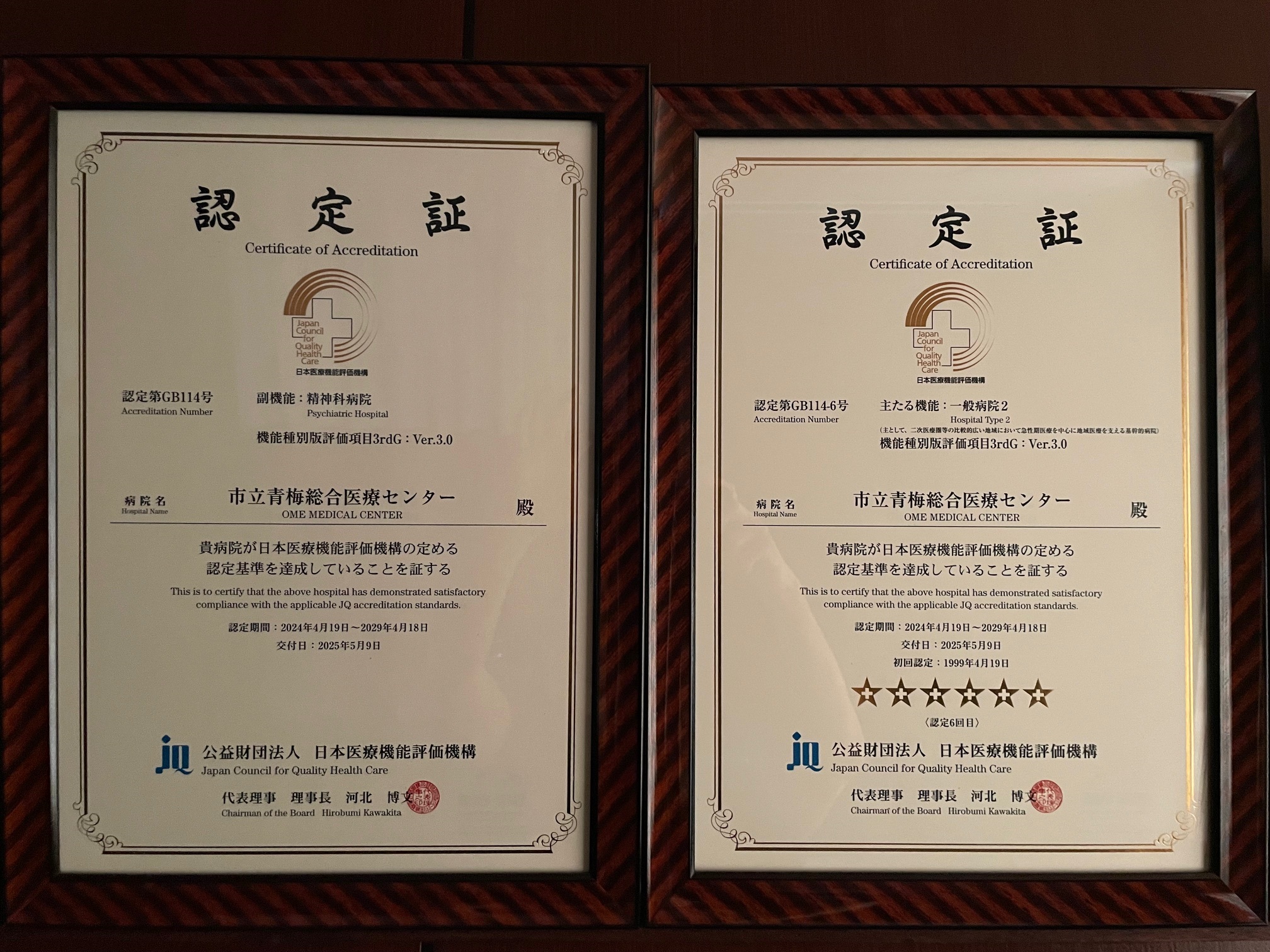 当医療センターは、平成11年4月に最初の認定を受け、令和7年5月9日に同機構より「一般病院2(500床以上)(主たる機能)、精神科病院(副機能)」の種別・区分での6回目の更新を受けました。