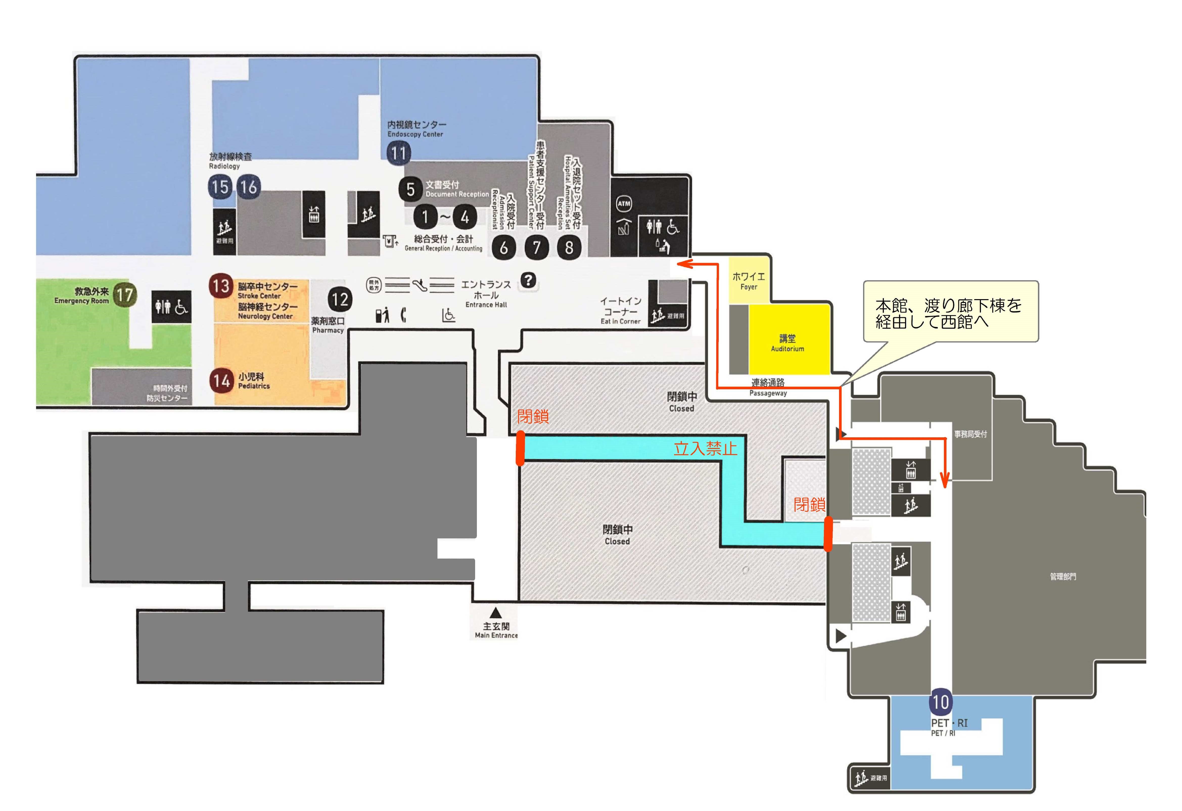 つきましては、西館(放射線治療科、PET・RI、リハビリテーション科、血液浄化センター、4C病棟、5C病棟)へ御用の際は、本館より渡り廊下棟を経由していただきますようお願いいたします。