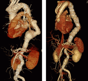 広範な胸部大動脈瘤に対する人工血管置換術+ステントグラフト内挿術