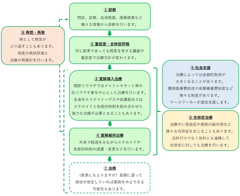 疾患によって異なる場合はありますが、膠原病・リウマチ性疾患の診断と治療は、図のような流れですすみます。